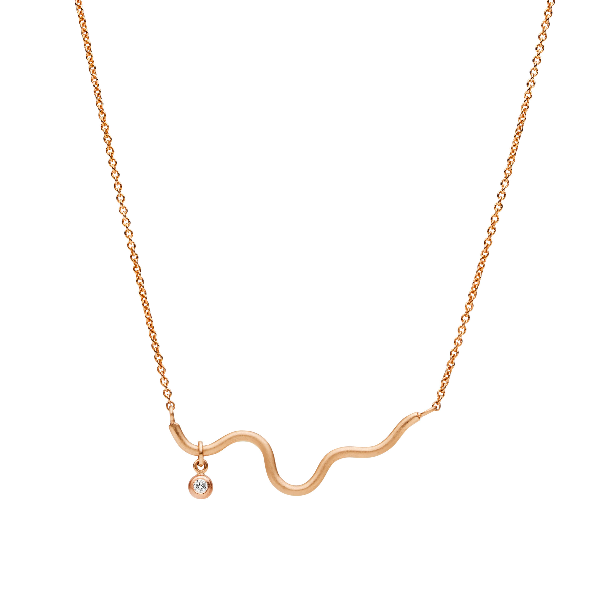 A 9ct rose gold Chronos Necklace with a white diamond charm that moves freely along the golden wave. Total necklace length 42cm and wave is approximately 32mm x 10mm.