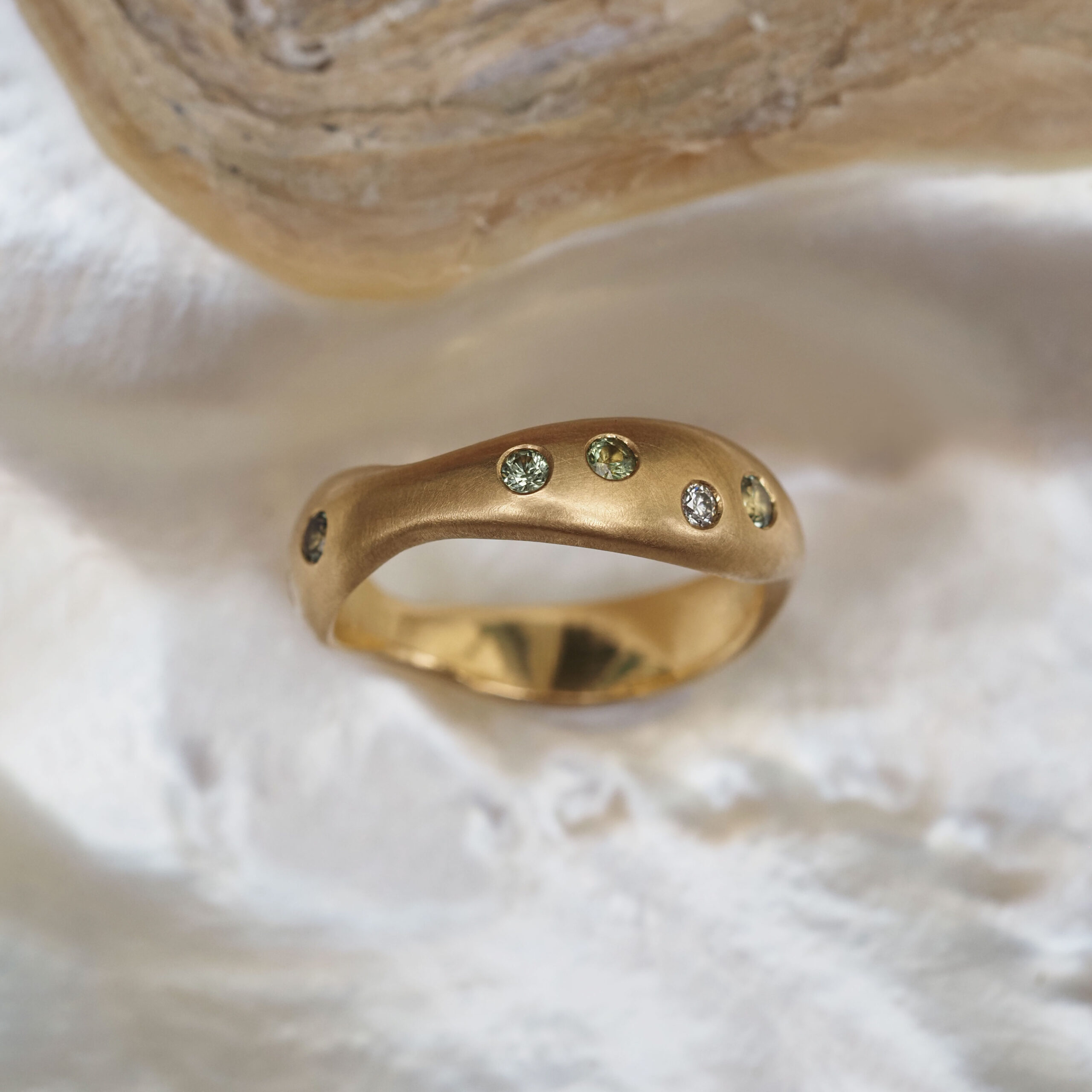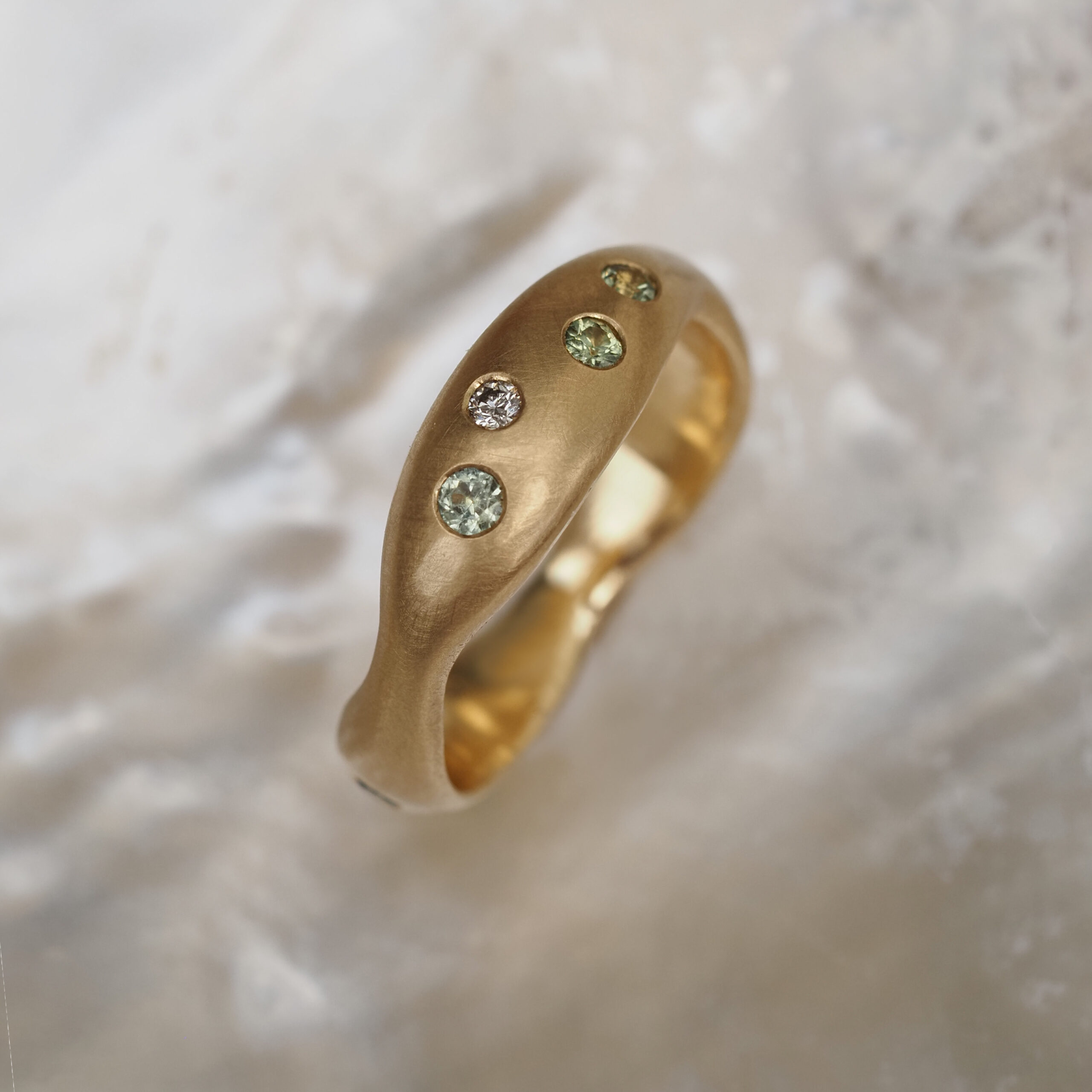 18ct yellow gold ring set with Australian green parti sapphires from Queensland and Australian grey diamonds from Western Australian. The ring has a brushed, matte finish. Ring size M1/2 but can be resized.