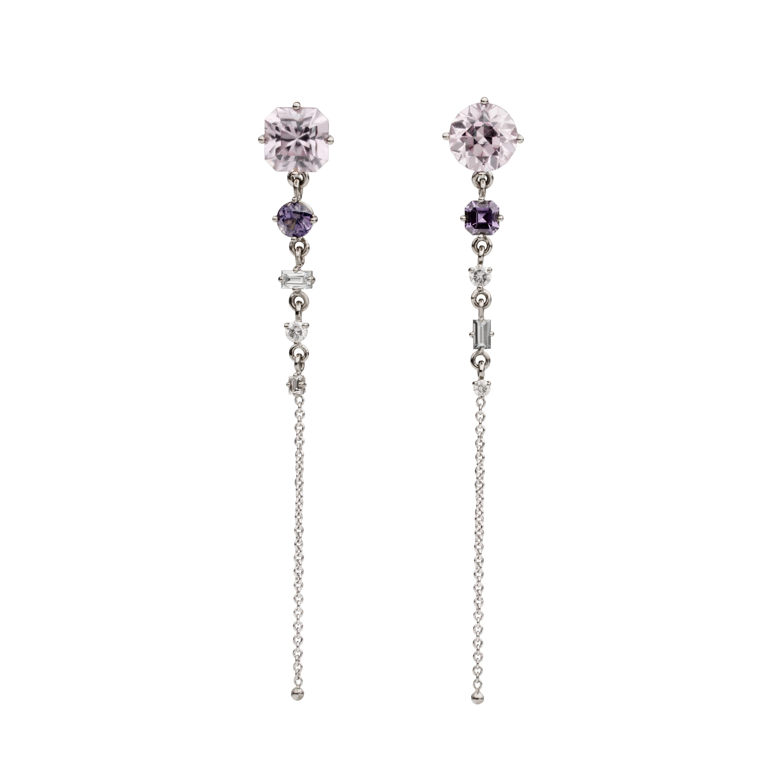 18ct white gold drop stud earrings with Australian zircons from the Northern Territory, Australian purple sapphires from Queensland and Australian grey diamonds from Western Australia with 9ct white gold chains. Each earring is 65mm in length.