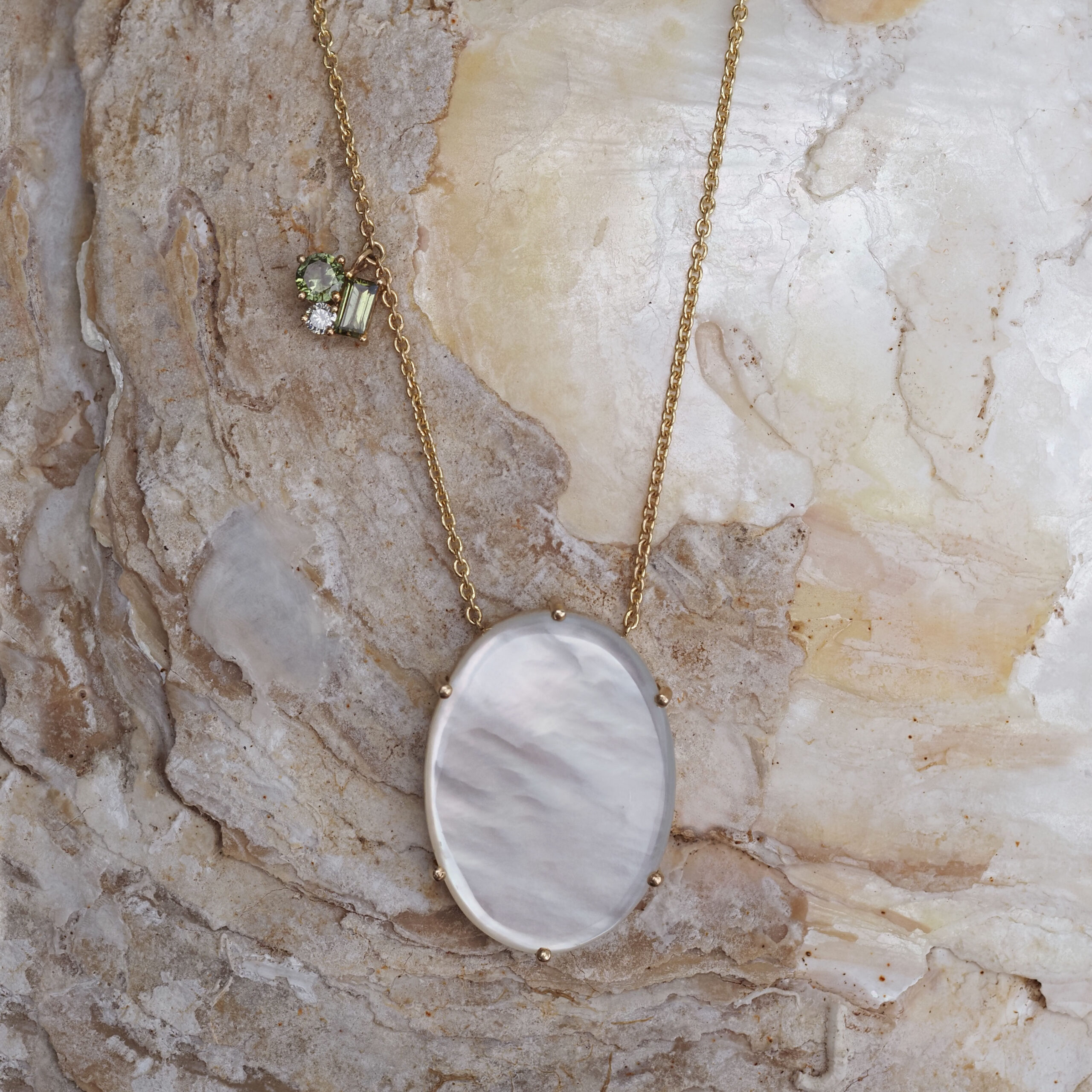 “Inspired by fragments collected along the tide line, this necklace blend hand-carved South Sea mother of pearl with Australian gemstones celebrating the colours, textures and treasures the sea leaves behind.”